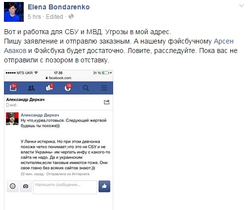 "Вот и работка для СБУ и МВД. Угрозы в мой адрес. Пишу заявление и отправлю заказным. А нашему фэйсбучному Арсену Авакову и Фэйсбука будет достаточно. Ловите, расследуйте. Пока вас не отправили с позором в отставку", – заявила Бондаренко, обнародовав скрин-шот сообщения с угрозами.