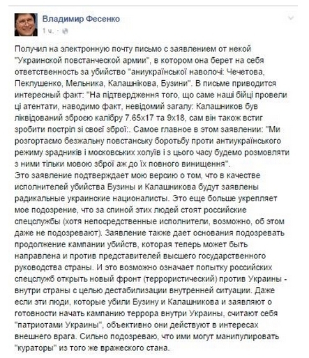 "Это заявление подтверждает мою версию о том, что в качестве исполнителей убийства Бузины и Калашникова будут заявлены радикальные украинские националисты. Это еще больше укрепляет мое подозрение, что за спиной этих людей стоят российские спецслужбы (хотя непосредственные исполнители, возможно, об этом даже не подозревают)", – сообщает Фесенко.
