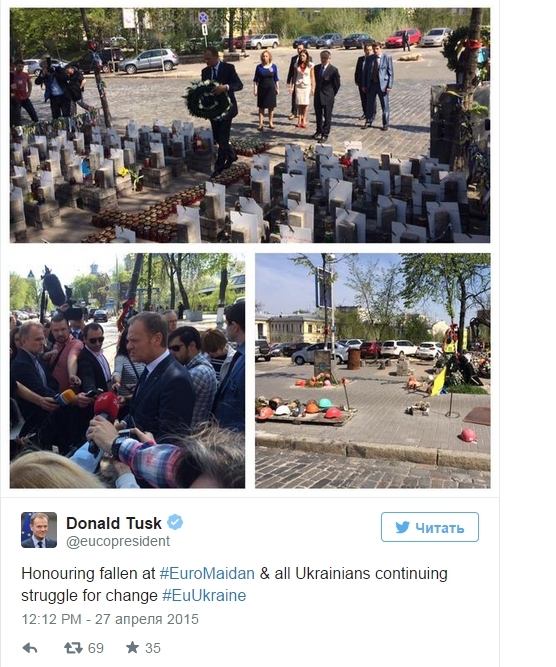 Президент Европейского совета Дональд Туск перед открытием саммита Украина-ЕС торжественно возложил цветы к мемориалу памяти Героев Небесной сотни. И сразу же оставил сообщение об этом и фото на своей странице в Твиттер