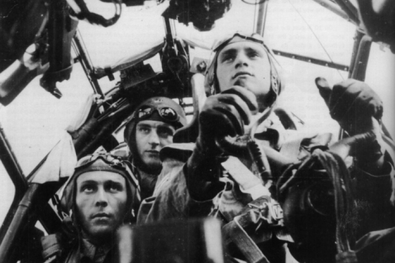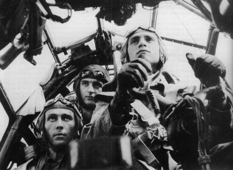 Немецкий экипаж в кабине бомбардировщика Ю-88 (Ju-88) из 71-й бомбардировочной эскадры (KG71). Сцена напоминает происходящее в полете, но снимок сделан через переднее остекление с земли. Расстегнутые подбородочные ремешки шлемофонов также указывают на «неполетную» природу снимка.
