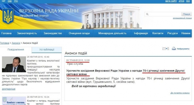 Верховная Рада после публикации новостной заметки в СМИ изменила название запланированного на 8 мая торжественного заседания по поводу 70-летия окончания Второй мировой войны. Пресс-служба украинского парламента обновила анонс на официальном сайте.