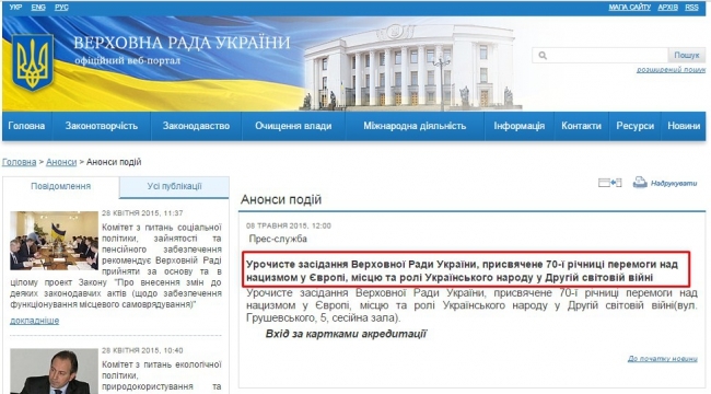 Ранее мероприятие было обозначено как "Торжественное заседание Верховной Рады Украины по случаю 70-й годовщины окончания Второй мировой войны".