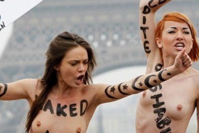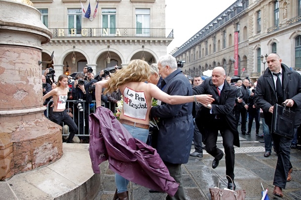 Традиционно девушки разделись - на этот раз только топлес. На их телах было написано, что Ле Пен является топ-фашистом.
