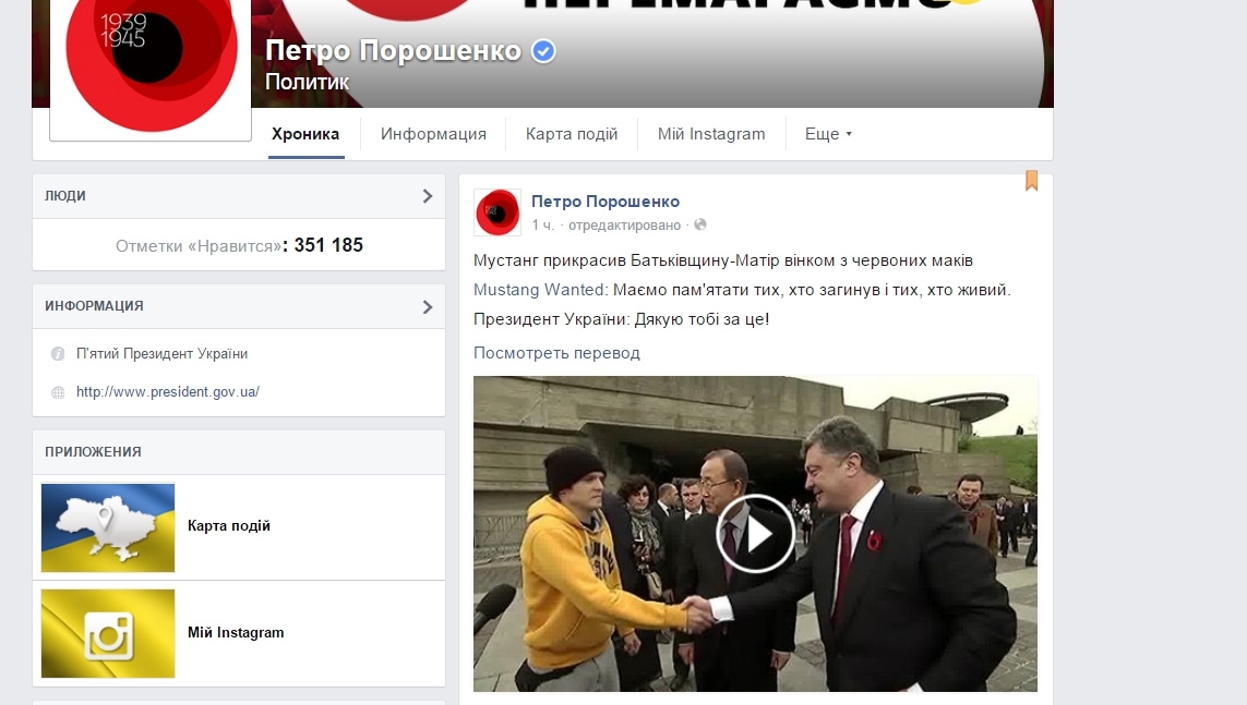 Как сообщается на странице Петра Порошенко на Фейсбуке, он, вместе с генсеком ООН Пан Ги Муном поблагодарил руфера, который к празднику украсил знаменитый столичный монумент Родина-мать венком из красных маков и разноцветными лентами.