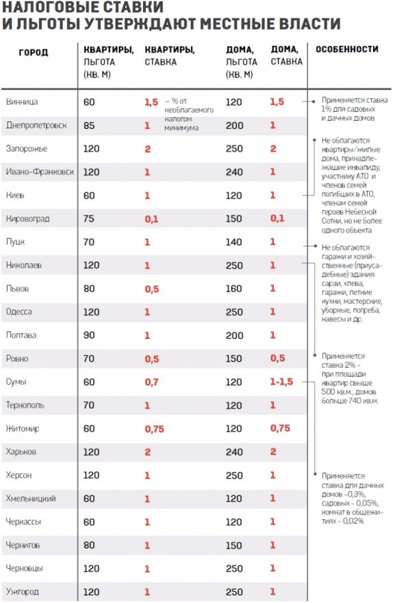 В некоторых городах ставка налога зависит от вида жилой недвижимости. В Сумах, например, ставка налога для квартир составляет 0,7%, а для домов — 1,5%, в Виннице налогом на недвижимость обложили квартиры и дома по ставке 1,5%, садовые и дачные дома по ставке 1%. Во Львове ставка налога для квартир на 2015 г. составит 0,5%, а для домов 1%.