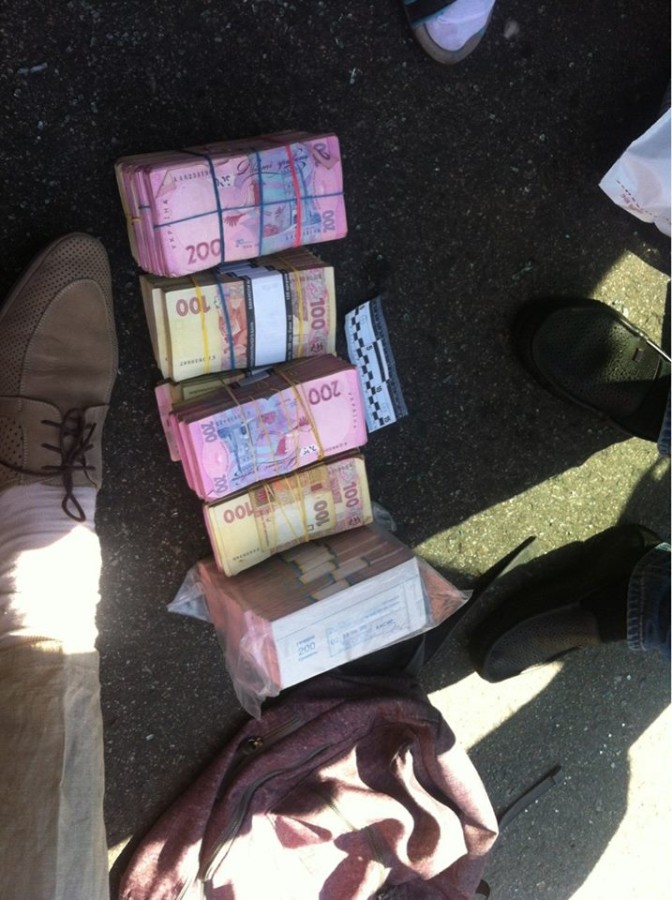 В машине изъято оружие и 500 000 грн. Курьеры задержаны. Идут обыска в банке и еще по 8 адресам дислокации участников группы. Изымаются значительно более крупные суммы денег и задерживаются участники преступной схемы.
