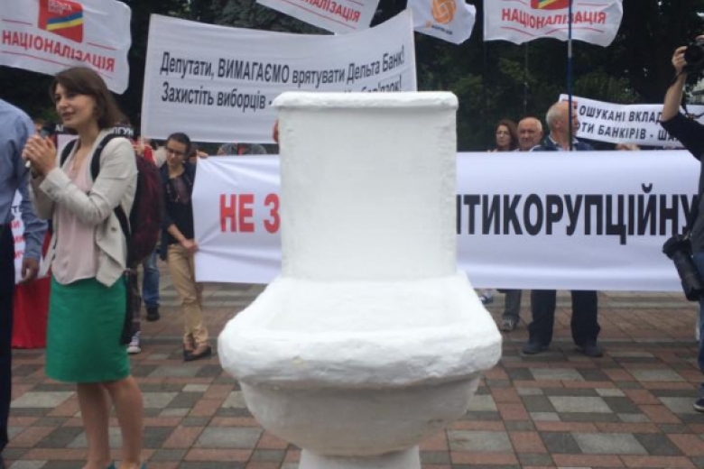 Напротив Рады они поставили большой унитаз. Митингующие призвали нардепов не поддерживать законопроект № 2667 в редакции Юрия Луценко, который делает новую антикоррупционную прокуратуру зависимой от президента.