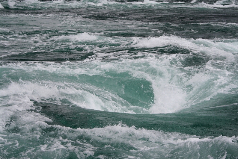 На этом снимке не столь заметны потоки бурлящей воды, но зато отчетливо просматривается само течение и люди, попавшие в него: