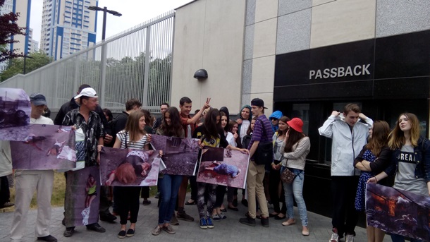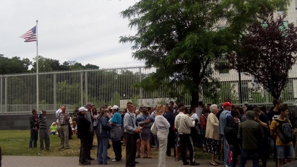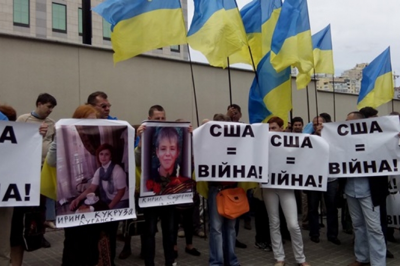 Пикетирую американское посольство в столице, люди держали в руках плакаты с фото погибших украинцев, в частности жителей Донбасса. По словам очевидцев, митингующие скандировали: "Солдаты США вон из Украины", "США ганьба".
