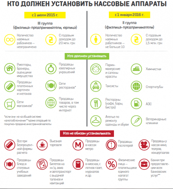 Вчера Минфин в «Фейсбуке» напомнил о введении новых правил и опубликовал, кого они коснутся (см. графику). «Я в шоке. Общая стоимость кассовых аппаратов, которые надо приобрести предпринимателям в соответствии с изменениями в налоговый кодекс, пролоббированными Яценюком и Ко, — 41 млрд грн. Пазл сошелся: понятно, что за такое баблище лоббисты сего решения и Христа бы второй раз распяли, а не то что предпринимателей Украины по миру пустить. Опять все в соответствии с заветами дедушки Маркса: продают мать родную. Хотя я бы поостерегся называть Украину родной матерью для Яресько. Да и у остальных в этой компании ни капли сыновьего и дочернего почтения к Родине не наблюдается», — написал у себя в «Фейсбуке» бывший глава Сумской налоговой Александр Семченко.
