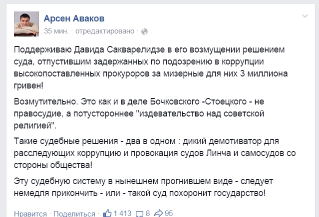 Как написал сегодня в ФБ глава МВД Украины Арсен Аваков, он полностью поддерживает заместителя генпрокурора Украины Давида Сакварелидзе в его возмущении решением суда, отпустившим задержанных по подозрению в коррупции высокопоставленных прокуроров за мизерные для них 3 миллиона гривен.