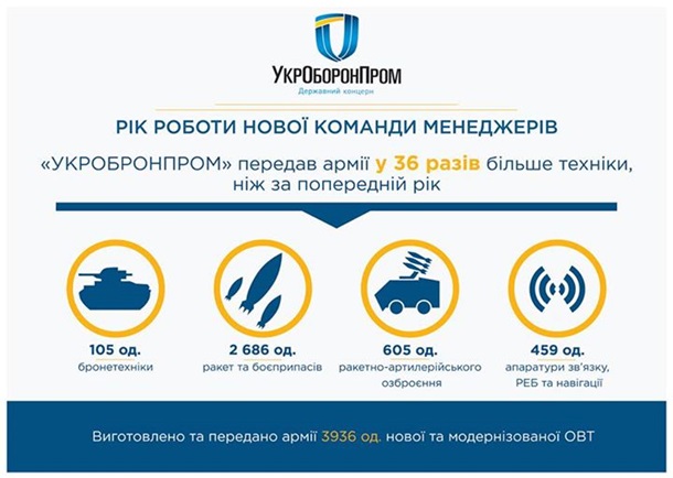 Как сообщает пресс-служба госпредприятия "Укроборонпром", за год они собрали и передали армии 3936 единиц нового и модернизированного оружия, а также военной техники. Это в 36 раз больше, чем за аналогичный период 2014 года.