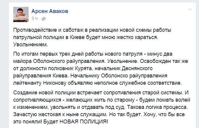 "По итогам первых трех дней работы нового патруля - минус два майора Оболонского райуправления. Увольнение. Освобожден так же от должности полковник Курята, начальник Деснянского райуправления Киева. Начальнику Оболонско райуправления лейтенанту Никонову объявляю неполное служебное соответствие.