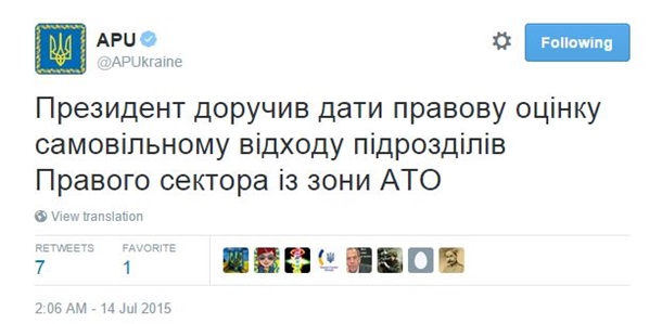 Об этом в пресс-службе заявили после того, как на микроблоге появилось сообщение относительно ухода ДУК "Правый сектор" из зоны АТО, которое в АП опровергли.