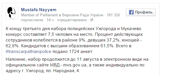 "К концу третьего дня набора полицейских Ужгорода и Мукачево конкурс составляет 7,5 человек на место. Процент действующих сотрудников все еще колеблется в районе 9%, девушек 37,2%, юношей - 62,8%. Всего в #transcarpathianpolice (хэштег для новой полиции Закарпатья - ред.) подано 1724 анкет", - сообщил нардеп.