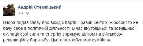 "Подал заявление о выходе из партии "Правый сектор". Я лично не вижу себя в политической деятельности. В ходе внутренней и внешней оккупации свои силы и энергию направлю полностью на военно-революционную борьбу. Этого требует моя совесть", - написал Стемпицкий во вторник в своем Фейсбук.