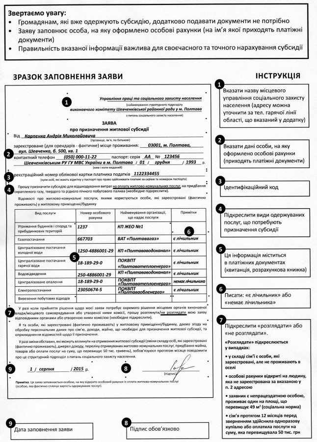 ШПАРГАЛКА. На фото видно, как правильно заполнять заявление и декларацию о доходах. Так, данные для заявления, нужные для пункта 1, можно узнать по телефону горячей линии в приложении к декларации. В пункте 2 пишем ФИО владельца лицевого счета, 3 — его идентификационный код, 4 — вид услуги (ЖКУ, покупка твердого или жидкого топлива) подчеркнуть, 5 — информация о поставщиках услуг (имеется в платежках), 6 — надо указать, есть или нет счетчиков, 7 — если у просителя субсидии есть обстоятельства, из-за которых ее могут не назначить (жилплощадь более 49 кв. м на одного человека, в квартире прописаны, но не живут члены семьи, и т. д.) — здесь указать, что заявление должна рассмотреть комиссия, 8 и 9 — поставить дату и подписать заявление.