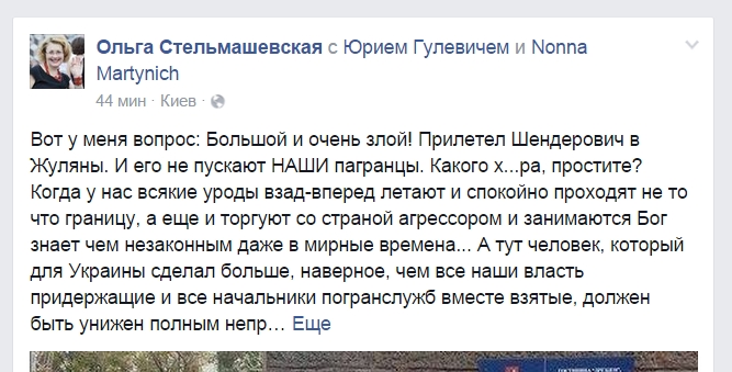 "Прилетел Шендерович в Жуляны. И его не пускают НАШИ пагранцы. Почему, простите? Когда у нас всякие уроды взад-вперед летают и спокойно проходят не то что границу, а еще и торгуют со страной агрессором и занимаются Бог знает чем незаконным даже в мирные времена... А тут человек, который для Украины сделал больше, наверное, чем все наши власть придержащие и все начальники погранслужб вместе взятые, должен быть унижен полным непрофессионализмом и хамством наших служб?! Вот с какого? Ну почему мы так позоримся на ровном месте?! Вот где вы, господа политики со своими выборами! Поднимите зады, извинитесь перед человеком", - возмущается в Соцсетях Ольга Стельмашевская, представитель концертного агентства Дель-Арте.