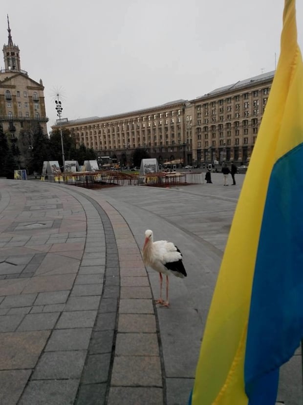 На Майдане Незалежности в Киеве прохожие сфотографировли аиста. Киевляне тут же восприняли появление птицы, как добрый знак.