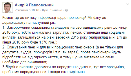 Экс-нардеп Андрей Павловский обнародовал некоторые предложения Министерства финансов Украины в госбюджет на 2016 год.
