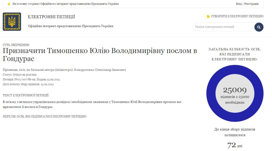 Как ранее могло показаться, шуточная петиция №22/007786-еп о назначении экс-премьера и лидера "Батькивщины" послом нашей страны в Гондурасе намного раньше срока набрала необходимое количество голосов на официальном интернет-ресурсе Президента Украины.