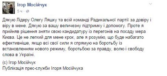 "Спасибо лидеру Олегу Ляшко и всей команде Радикальной партии за доверие и веру в меня. Спасибо за вашу огромную поддержку и помощь. Однако я принял решение снять свою кандидатуру с выборов на пост мэра Киева", – говорится в сообщении.