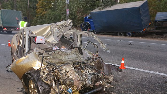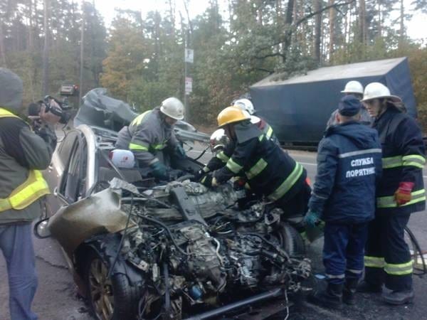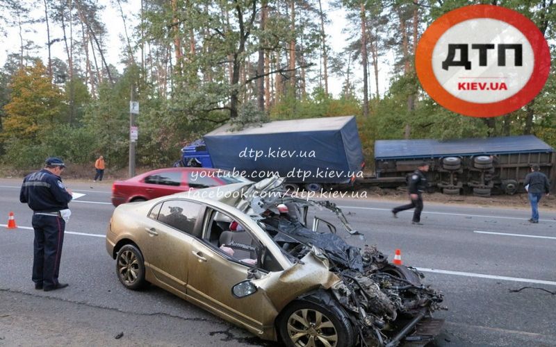 Эта версия подтверждается словами водителя фуры, который серьезно не пострадал. По его словам, он двигаясь в направлении Киева, метров за 500 до Гостомельского КП, увидел как навстречу на огромной скорости летит потерявший управление автомобиль. Мужчина принял максимально правее, съехал в кювет и в лес, однако столкновения избежать не удалось. "японка" ударилась о бок фуры. Кузов смяло. Водитель скончался мгновенно. Его тело зажало конструкциями автомобиля.