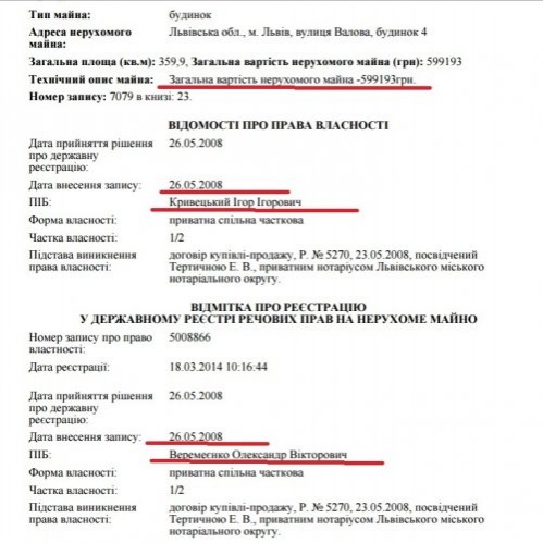 Как удалось выяснить изданию, в мае 2008 года Игорь Кривецький и Александр Веремеенко совместно приобрели 359,9 кв м в центре Львова за 599,2 тыс. грн. По крайней мере, именно такая сумма стоимости данной недвижимости - 1665 грн / м2 (330 $ / м2 на тот момент) - указана в официальном реестре.