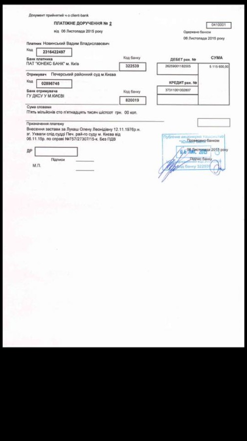 Народный депутат "Оппозиционного блока", бизнесмен Вадим Новинский внес 5 млн грн залога за бывшего министра юстиции Елену Лукаш.