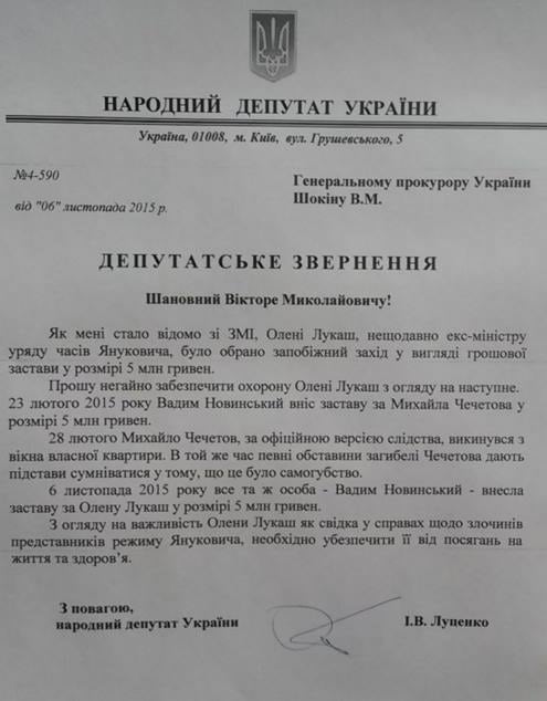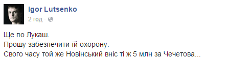 "Прошу немедленно обеспечить охрану Елене Лукаш ввиду следующего. 23 февраля 2015 года Вадим Новинский внес залог за Михаила Чечетова в размере 5 млн грн", - написал Луценко.