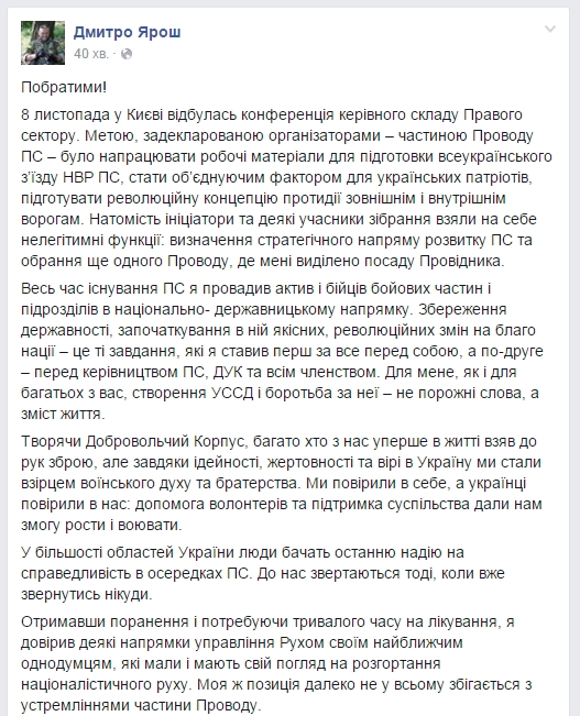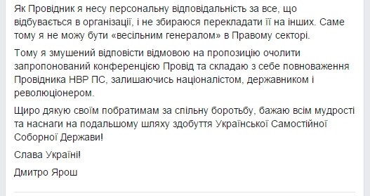 "Получив ранения и требуя длительного времени на лечение, я доверил некоторые направления управления движением своим ближайшим единомышленникам, которые имели и имеют свой взгляд на развертывание националистического движения. Моя же позиция далеко не во всем совпадает с их устремлениями", - пишет Ярош.