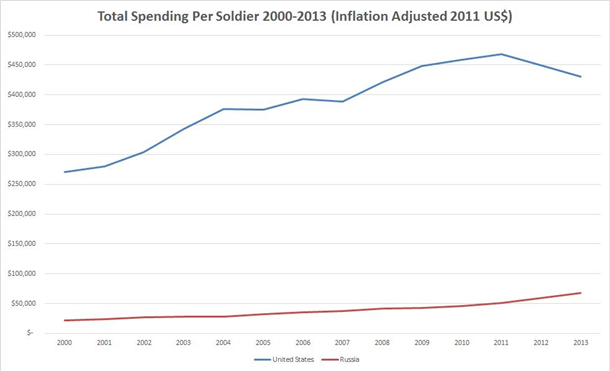 Если посмотреть на те деньги, которые тратятся на российскую и американскую армии, вряд ли можно сделать вывод о том, что у них почти равные боевые возможности. В расходах в расчете на солдата существует просто колоссальная разница.