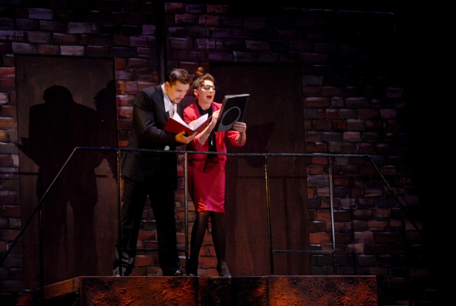 Актеры тут же на сцене выясняют личные отношения: поднимается скандал, занавес падает, дирижер пытается спасти ситуацию громкой музыкой, однако шум и крики выдают закулисную драку...