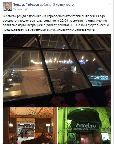 "В Симферополе комендантский час! Администрация города проводит рейды и выявляет кафе, рестораны и прочие заведения работающие после 22:00 с использованием осветительных приборов в нарушение режима ЧС", — написал он.