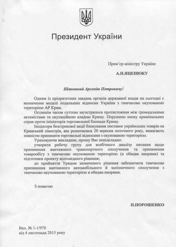Президент Украины Петр Порошенко обратился к премьер-министру Украины Арсению Яценюку с письмом, в котором предложил безотлагательно создать рабочую группу для всестороннего анализа вопроса о прекращении грузового транспортного сообщения и прекращения товарооборота с временно оккупированной территорией Автономной Республики Крым (в оба направления) и подготовки проекта соответствующего решения. Об этом сообщает пресс-служба главы государства.