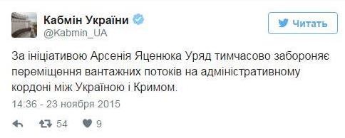 Кабмин временно по инициативе премьера Арсения Яценюка запретил перемещение грузовых потоков на административной границе между Украиной и Крымом.
