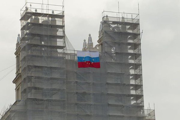 "Москва. На высотке на Котельнической набережной вывесили флаг Украины и флаг России с эмблемой ЕС", — говорится в сообщении.