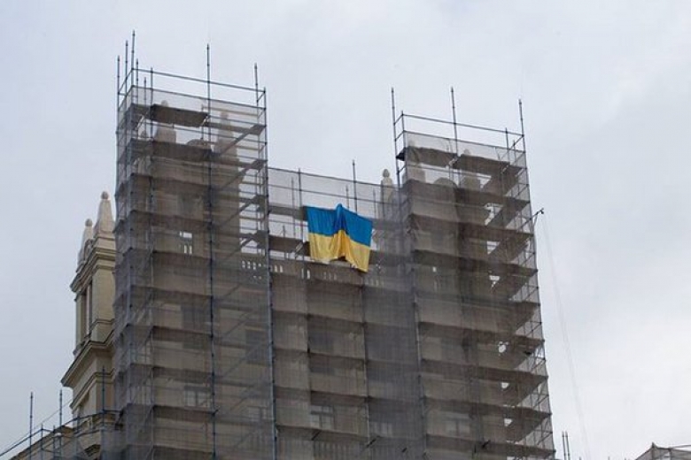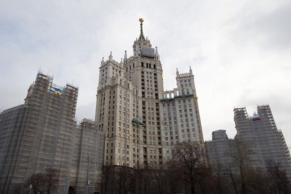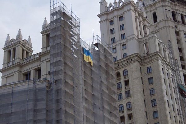 В Москве на строительных лесах высотного здания вывесили флаг Украины.