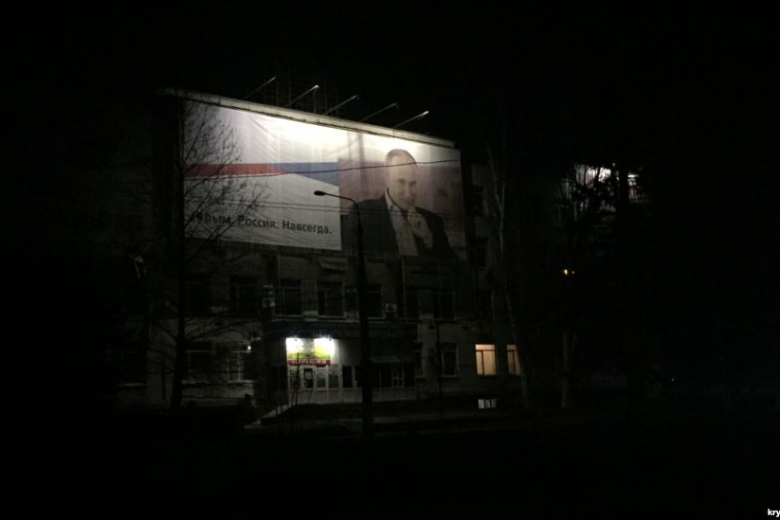В оккупированном Симферополе, не смотря на режим экономии электроэнергии в связи с подрывом опор линии электропередачи в Херсонской области, продолжают подсвечивать баннер с президентом РФ Владимиром Путиным.