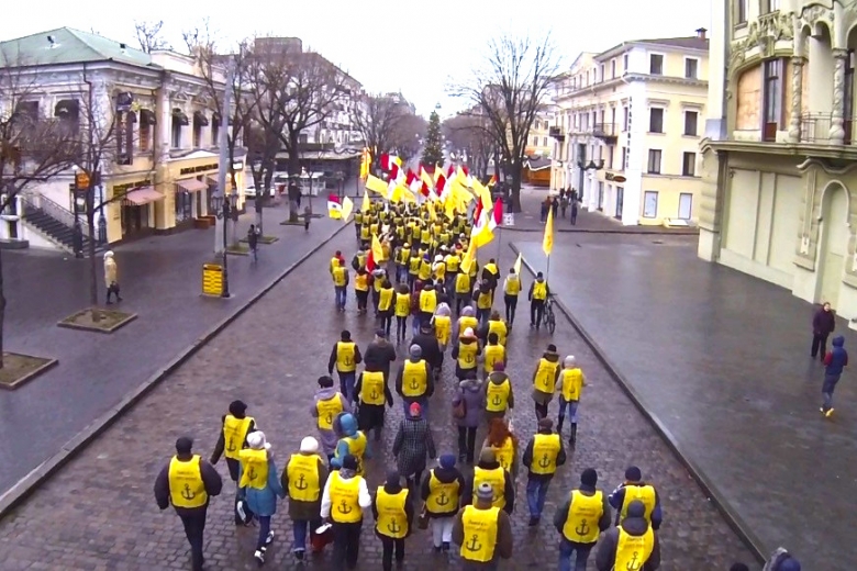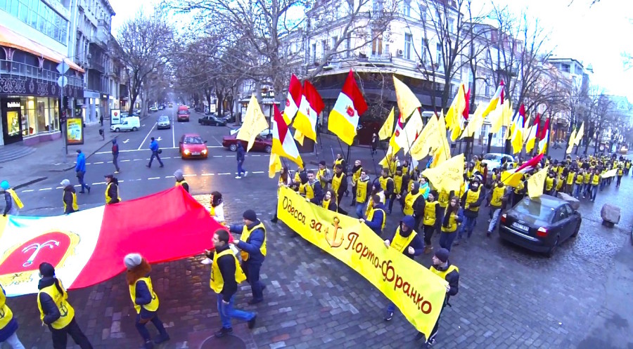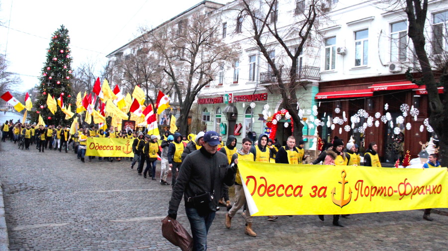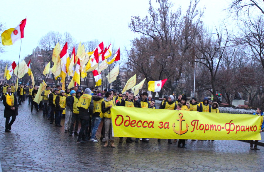 Сегодня более 500 активистов движения "Одесса - за порто-франко" провели марш в поддержку установления в Одесском регионе особого режима. Учаcтники акции держали огромный флаг Одессы, а также скандировали лозунги в поддержку возрождения зоны свободной торговли в регионе.