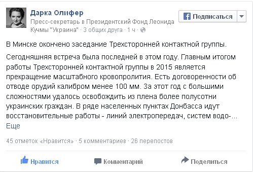 Кроме того, Олифер подвела итоги работы контактной группы в 2015 году. В числе достижений она называет освобождение из плена бовиков более полусотни украинских граждан, а также восстановление линий электропередач, систем водо- и газоснабжения, железнодорожного сообщения в ряде населенных пунктах Донбасса.
