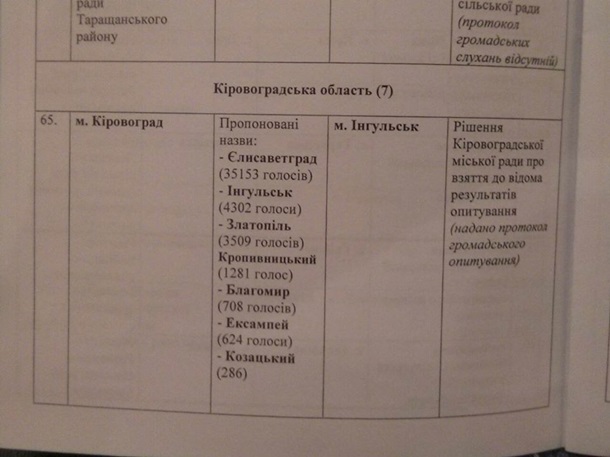 Переименование города состоится в рамках закона о декоммунизации. Местные власти не смогли сами выбрать название городу, и в конце октября направили на рассмотрение парламента семь возможных вариантов. На общественных слушаниях победили такие названия: Ингульськ, Златополь, Эксампей, Елисаветград, Кропивницкий, Казацкий, Благомир.
