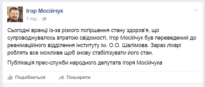 "Сегодня утром из-за резкого ухудшения состояния здоровья, сопровождающегося потерей сознания, Игорь Мосийчук был переведен в реанимационное отделение института им. Шалимова", – сообщила пресс-служба нардепа.