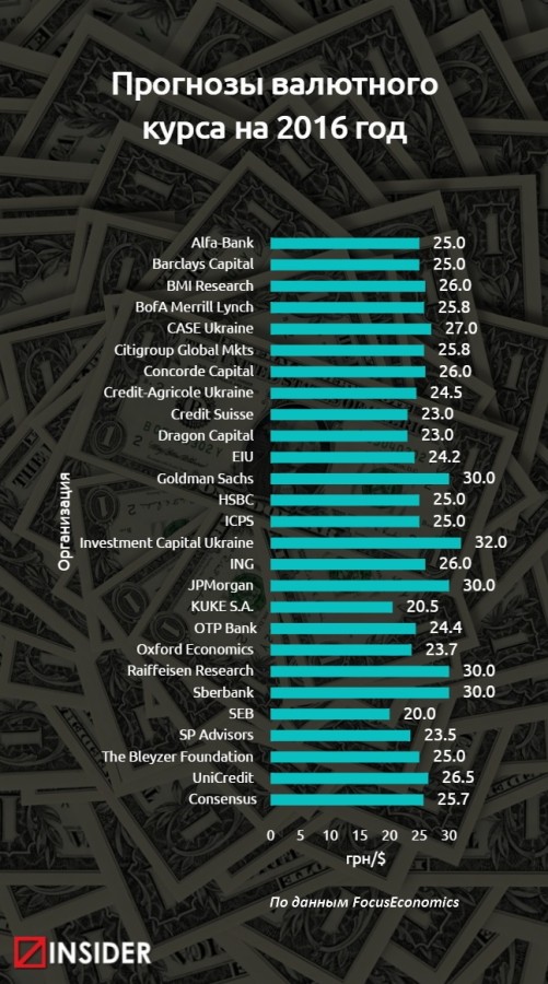 Вместе с тем, аналитики Сбербанка, американских Goldman Sachs и JPMorgan, а также Raiffeisen Research (Raiffeisen Bank International AG, Австрия) ожидают курс на уровне 30 грн/дол. Согласно отчету, оптимисты находятся в Швеции и Польше. Так, аналитики шведской финансовой группы SEB верят в ревальвацию гривны до 20 грн/дол, а в польской компании KUKE S.A. ждут в 2016 году курс на уровне 20,5 грн/дол. Консенсус – прогноз на следующий год – 25,7 грн/дол.