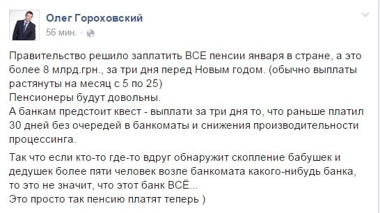 "Правительство решило заплатить все январские пенсии в стране — а это более 8 млрд грн — за три дня перед Новым годом. Обычно выплаты растянуты на месяц с 5-го по 25-е. Пенсионеры будут довольны", — отметил он.