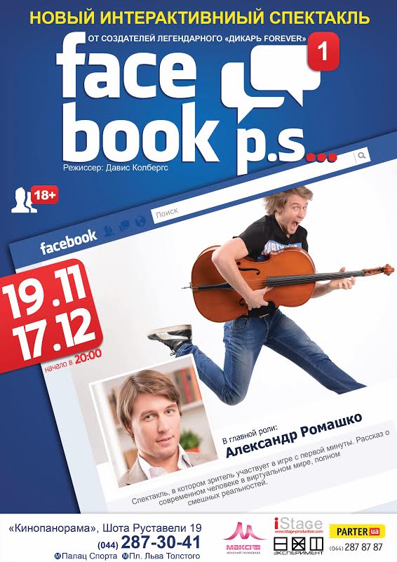 Главный герой моноспектакля «Facebook. PostScriptum», которого играет любимец публики и восходящая звезда украинского театра и кино Александр Ромашко, на время выступления разрушит границу между реальным и виртуальным миром, чтобы на многие рутинные вещи зрители посмотрели со стороны…