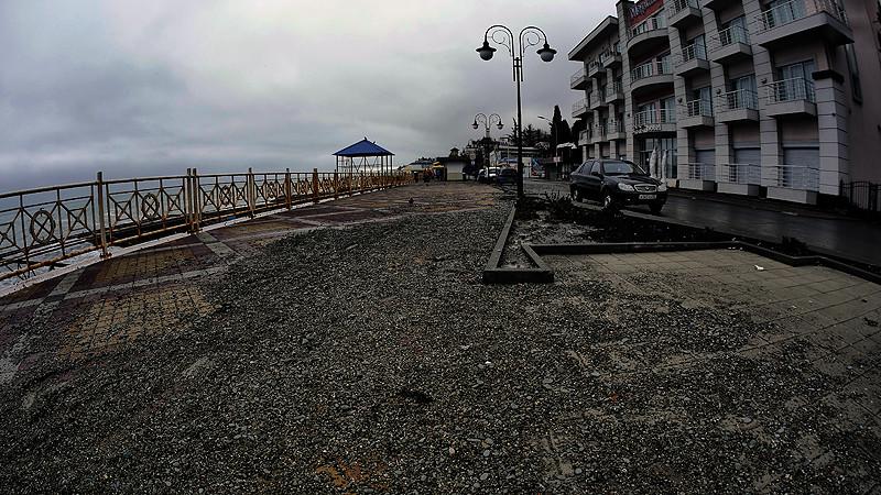 Непогода, разыгравшаяся два дня назад, засыпала набережную Алушты, поднятую на высоту в три метра, засыпав ее слоем мелких камней, доходящим в некоторых местах до 5 сантиметров.