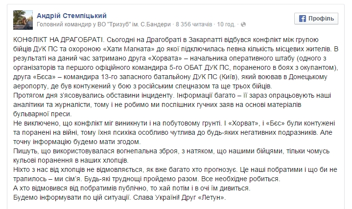 Командир ДУК Правый сектор Андрей Стемпицкий подтвердил, что по факту драки и поножовщины на турбазе Драгобрат задержаны бойцы ПС.