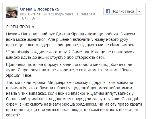 "Сам Дмитрий Ярош очень долго был против своего имени в названии... Но нам удалось его убедить ", - пишет Елена Белозерская в своем посте в Facebook.
