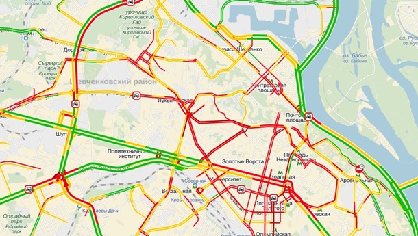 Затруднено движение по улицам Бассейной, Шелковичной, Круглоуниверситетской, Крещатик , Богдана Хмельницкого, Бориса Гринченко, Институтской, Ольгинской, Городецкого.
